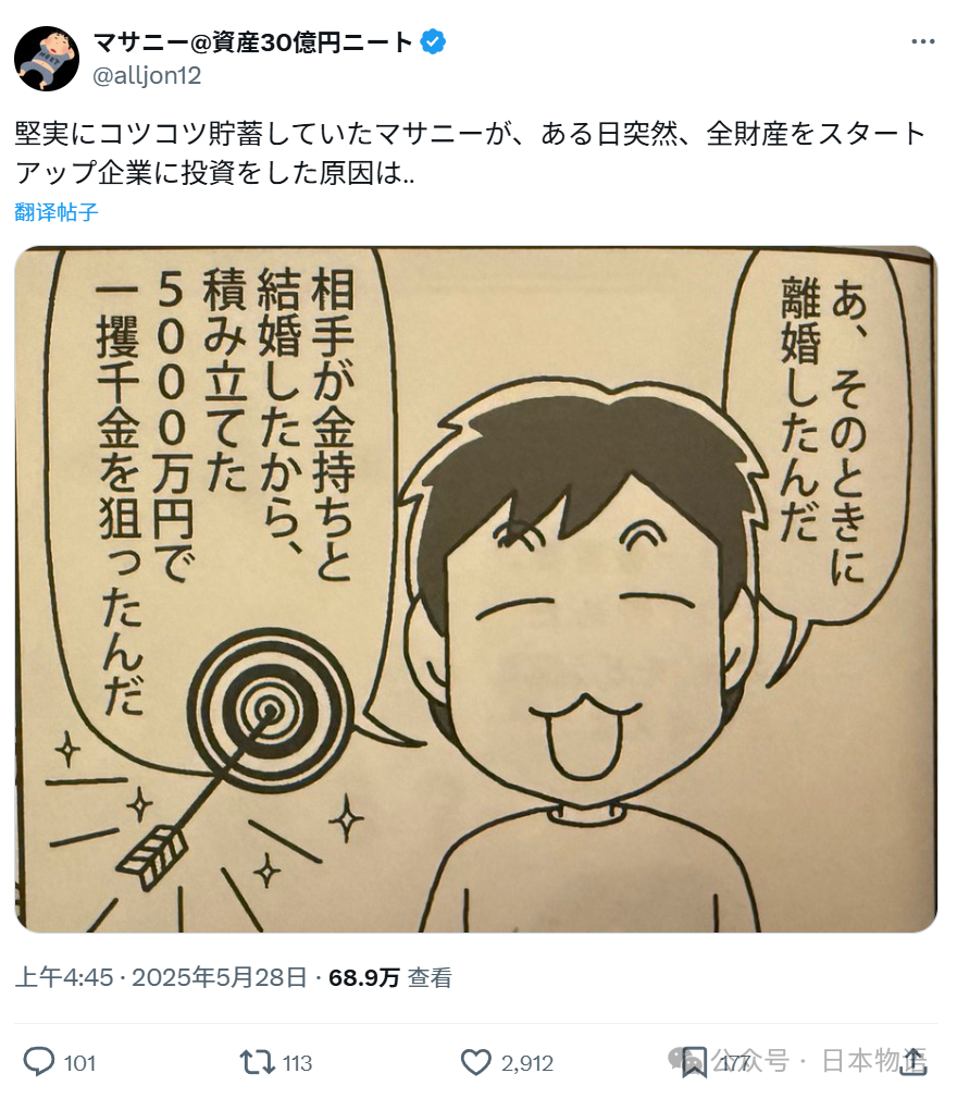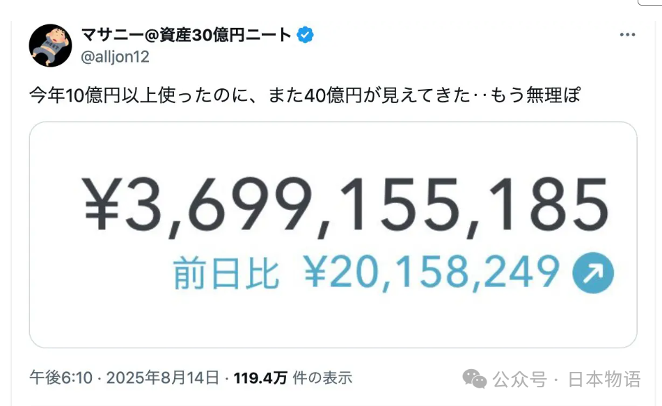 在日本的网络上,有个叫“マサニー”的人,常常引发争议。他自称是“资产三十多亿日元的尼特族”,最新晒出的资产图里,金融资产37亿日元,总资产接近60亿日元。放在经济下行、物价飞涨的当下,这个数字真是刺激到大家——有人在超市挑半价便当,他却抱怨“复利太恐怖,怎么都花不完……”